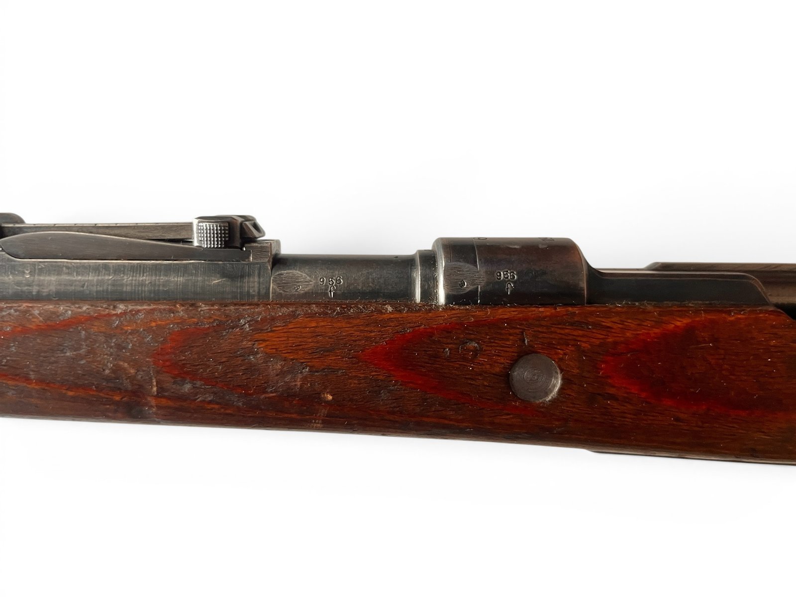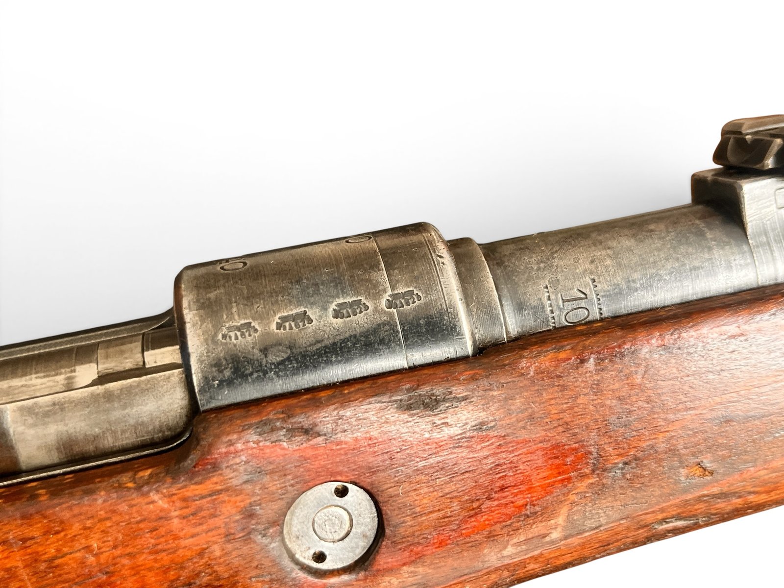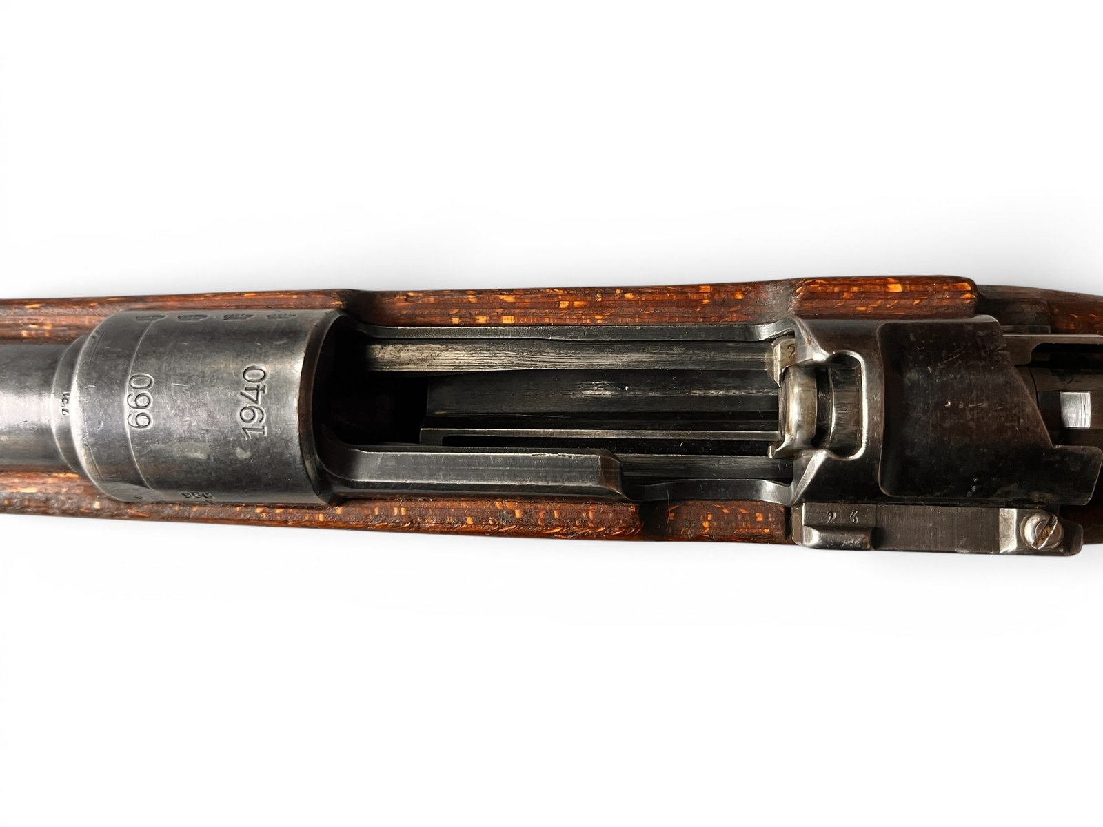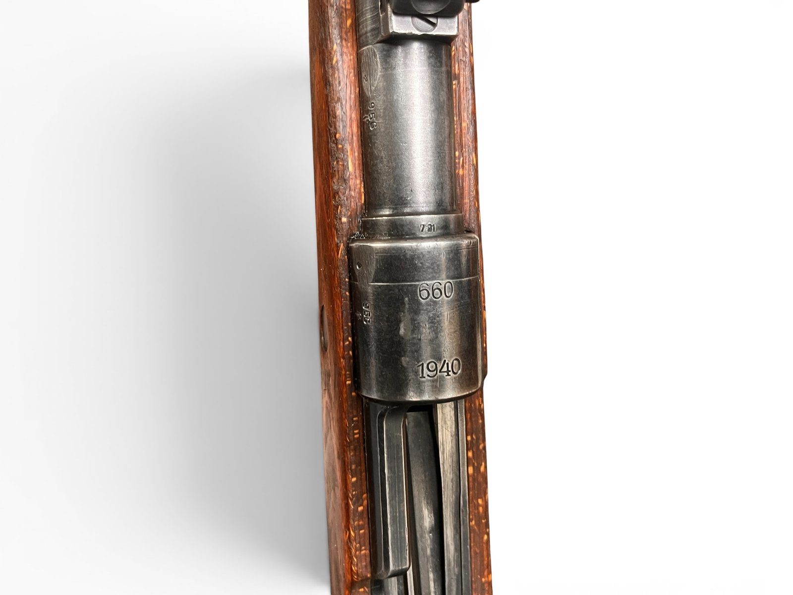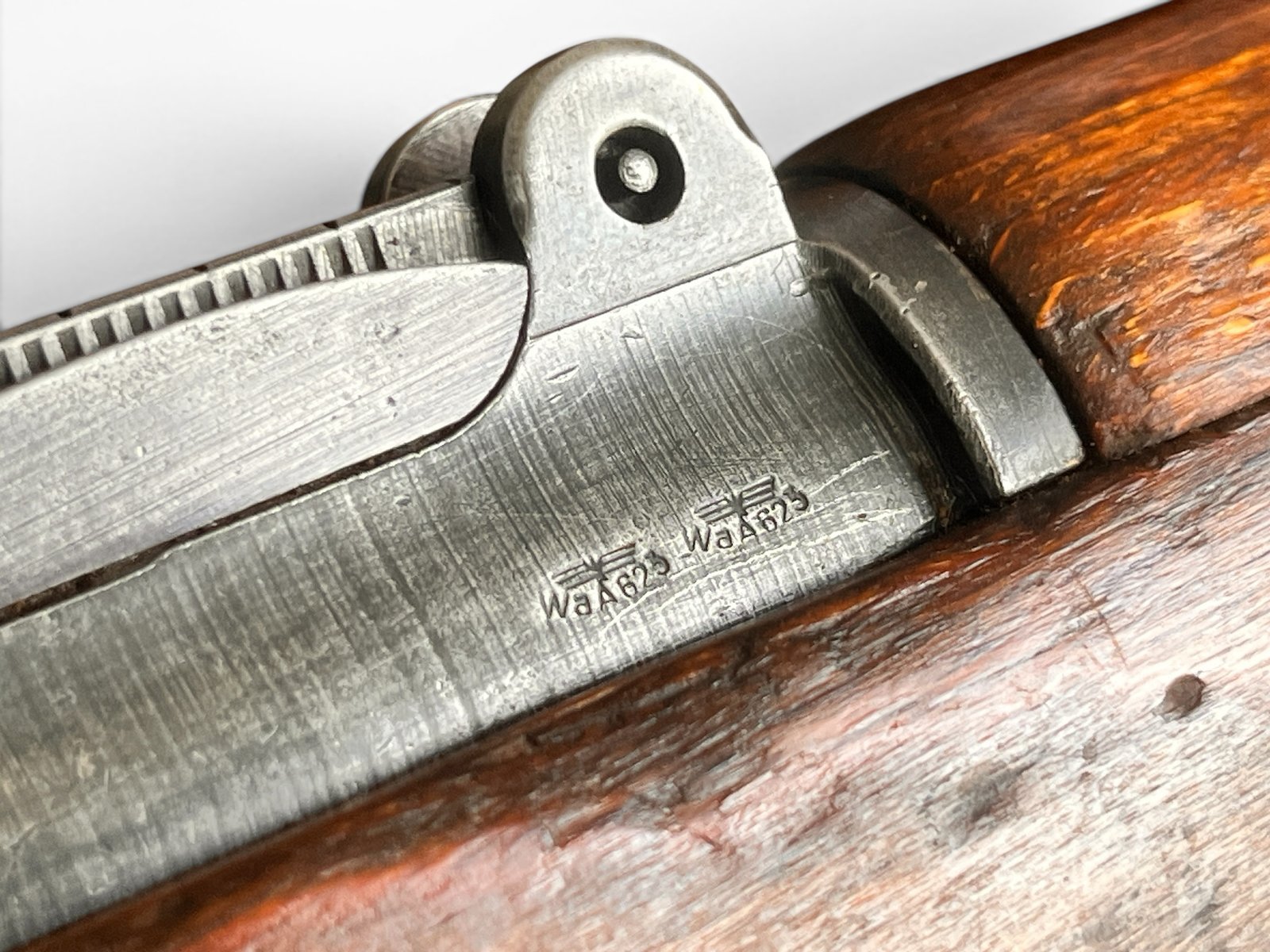 Karabiny K98k produkowane w zakładach Steyr (kod fabryczny „660”) to klasyka gatunku. Ten egzemplarz z 1940 roku jest naszpikowany historią, o czym świadczą liczne i dobrze zachowane bicia Waffenamt (WaA623). Jest „niezgodny numerycznie”, co jest typowe dla broni, która przeszła przez wojnę i późniejsze remonty arsenałowe – części były wymieniane, by utrzymać broń w służbie. To czyni go idealnym egzemplarzem dla strzelca, który chce poczuć historię na ramieniu, bez obaw o strzelanie z idealnie zgodnego, cennego egzemplarza kolekcjonerskiego.